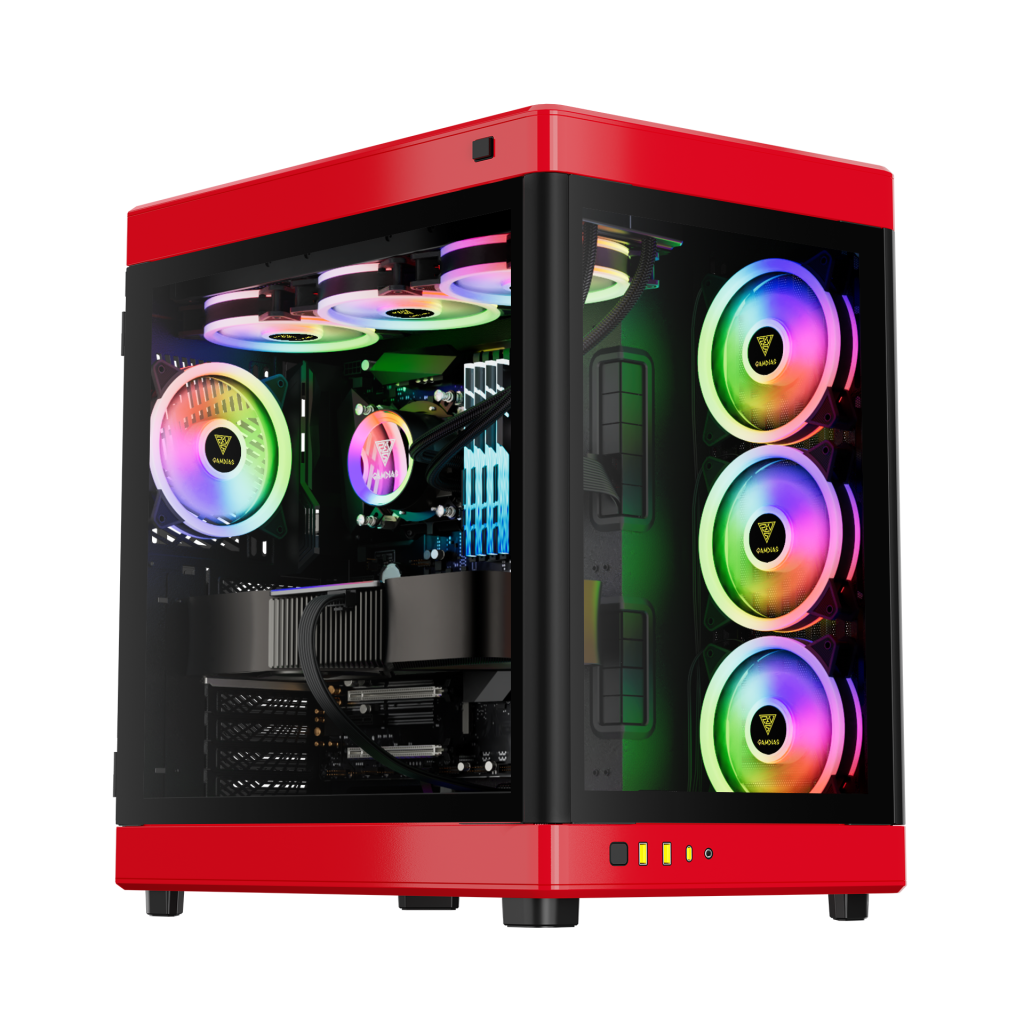The NESO P1 BR in red is a design spectacular, a trapezoid shaped case for horizontal desktop and vertical tower setup looking amazing on any desk.
