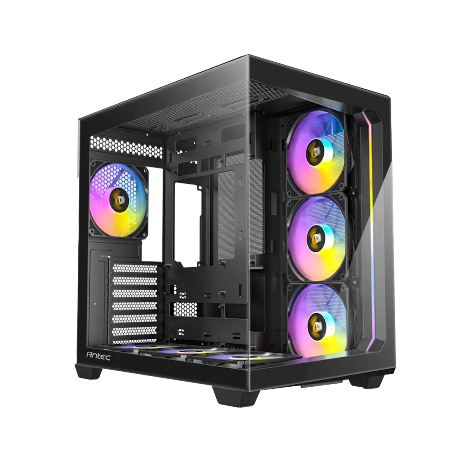 The Antec C5 ARGB Mid Tower case features a 270° full-view tempered glass panel with a stylish front ARGB lighting strip. It supports up to ten fans for vertical cooling, dual chambers for independent cooling, and ample space for water cooling. The case includes seven pre-installed ARGB fans.